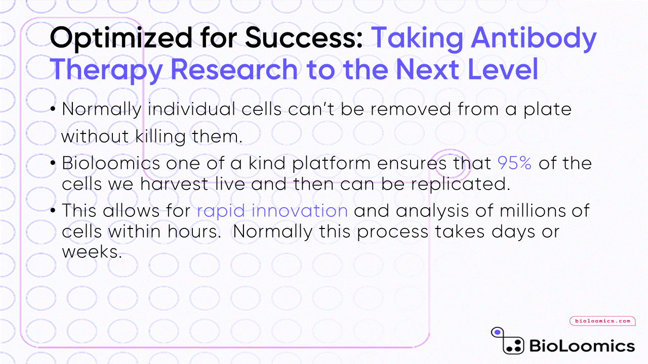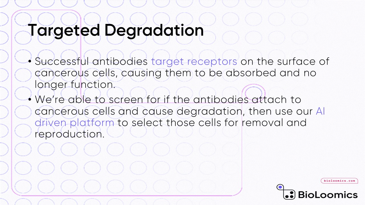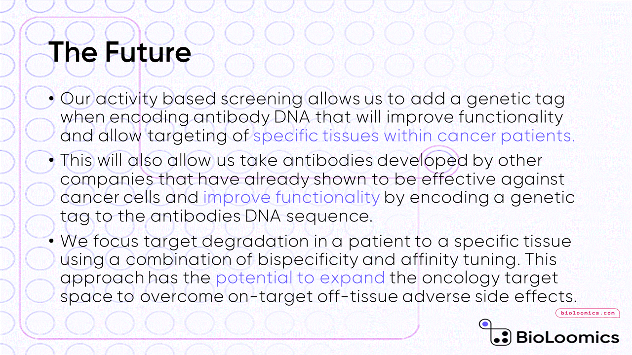 Bioloomics needed a public facing animation to show how their innovative antibody therapy works. They needed something that would accurately describe the mechanism of action and create interest. They also wanted a slide deck for investors and employees showcasing how their revolutionary technology is different from current antibody therapies.