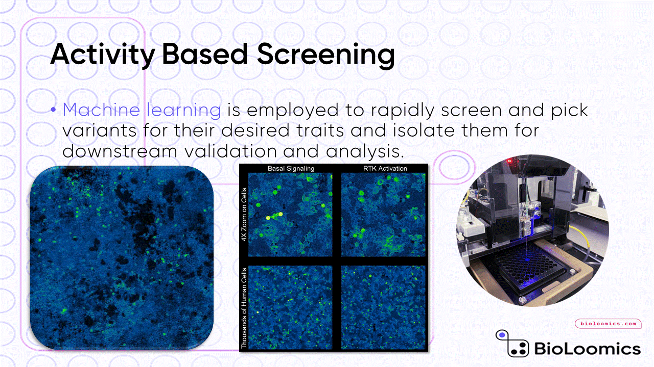 Slide Deck: It was important to use domain specific language in as few words as possible while letting the images and animations showcase the technology. During our first meeting I took notes and organized the information into subsections that would best convey the main ideas. The focus was on how groundbreaking the cell picking technology is, and how Bioloomics AI driven selective evolution methods make them stand out from others in the industry.