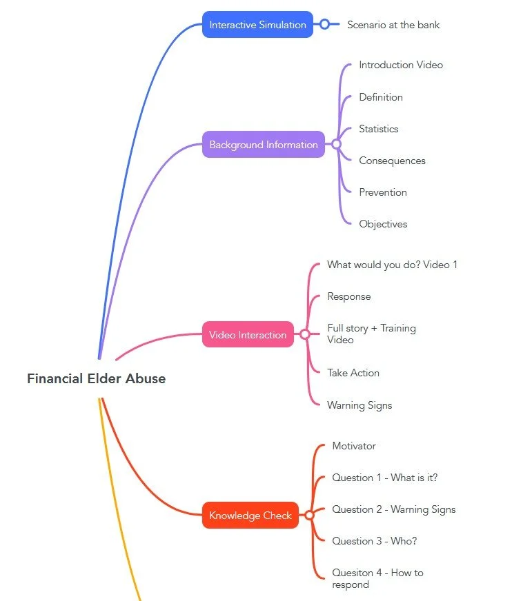 The process began by meeting with the Subject Matter Expert (SME), an HR representative from the credit union. I asked a series of targeted questions to narrow down what exactly was happening with employees during these interactions, and to prioritize which information they would need to successfully recognize and respond to elder financial abuse.