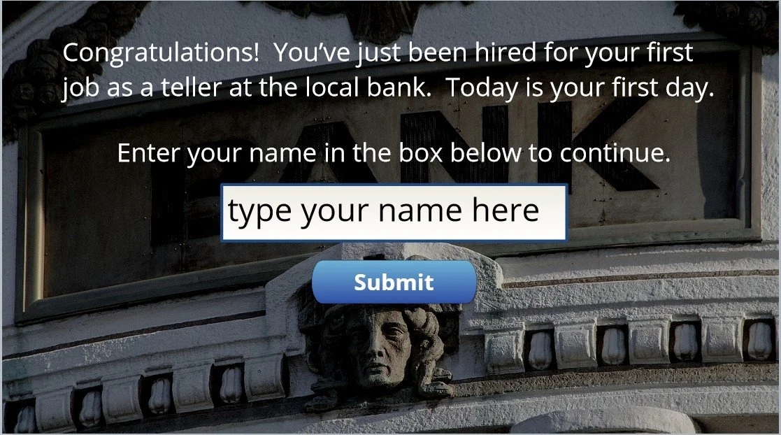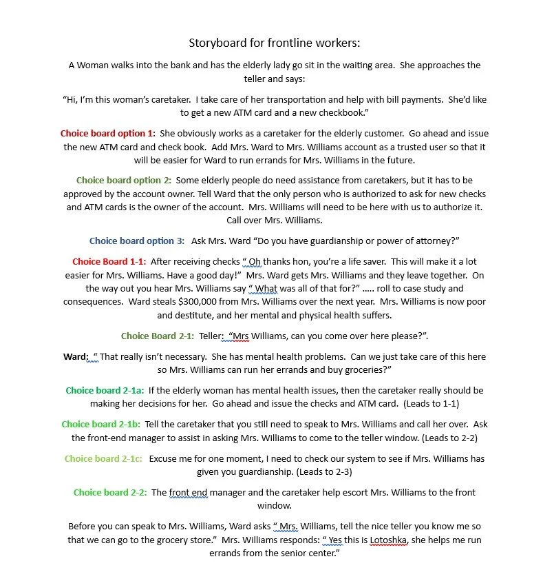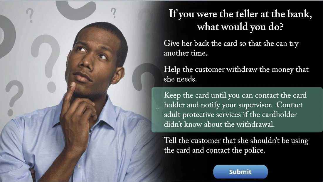 I proposed an interactive simulation where the bank employee would have to make difficult choices when confronted with an aggressive customer, followed by in depth training information on how to recognize the signs of financial elder abuse and how to respond.